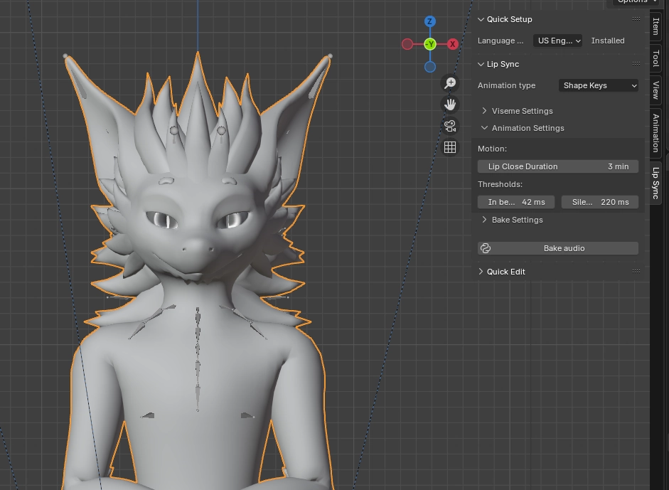 Now to do the actual sync. First, know you’ll need shape keys for each individual sound, in the language you chose(In my case, the model I’m using already comes with them setup). Select your model on the editor screen, then on the right, click Lip Sync