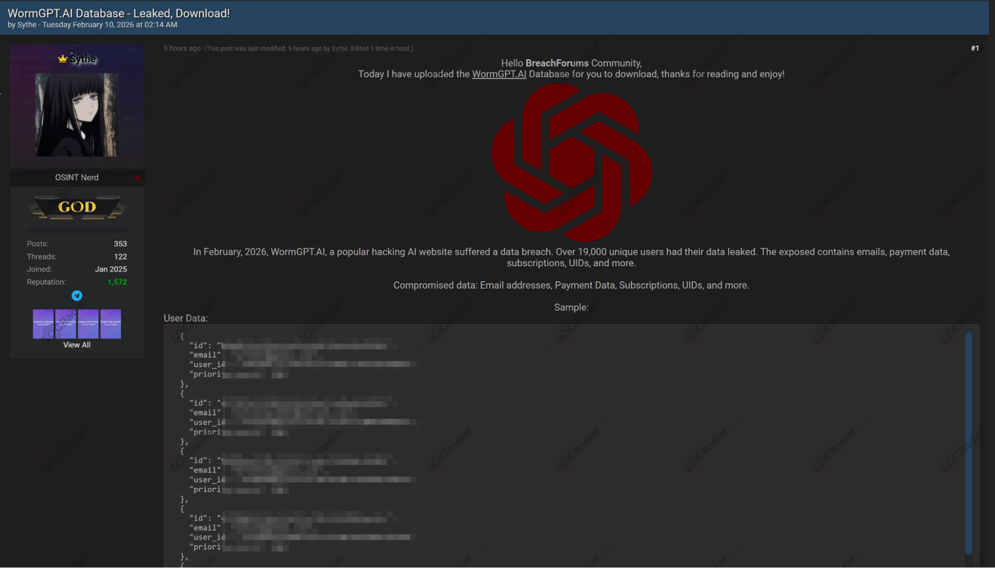 In a related development, a threat actor has claimed responsibility for a database leak involving WormGPT, a platform promoted in underground forums as an AI tool designed for offensive security operations, phishing, and other malicious activities. The post states that the incident occurred in February 2026 and that the database is now available for public download.