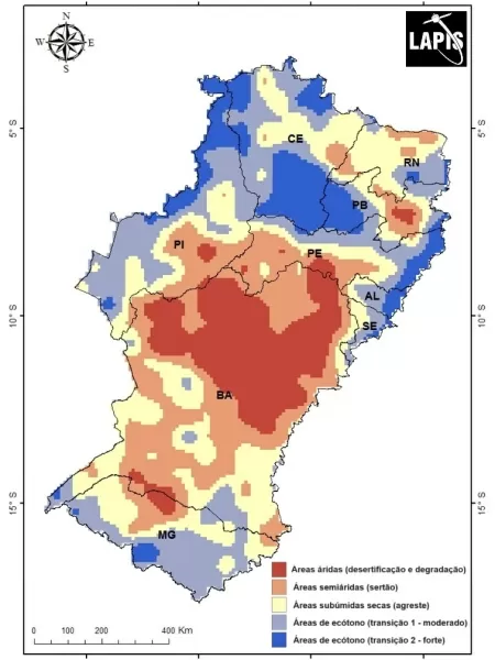 The above map, made by the Satellite Image Analysis and Processing Laboratory, from the Federal University of Alagoas(Lapis, Ufal), displays in dark red arid areas.