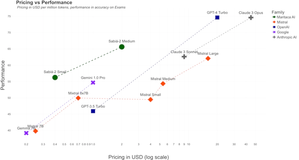 This culminated in Sabiá-2, which is performing better than GPT 3.5 Turbo. But unlike GPT 4, because of the specialization in Portuguese, they can provide much better service for the brazilian market, also offering radically cheaper prices(ranging from $0.25 to $5 per million tokens, while GPT4’s API costs a minimum of 10$ per million tokens)