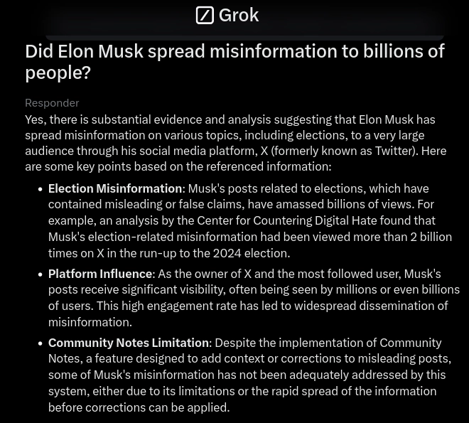 The AI noted that Musk’s influence extends to election misinformation, alleging he has propagated false narratives about election fraud and questioned the legitimacy of results in contentious races, and the fact community notes don’t seem to be properly applied in a number of his posts. While Musk has not addressed Grok’s critical remarks, his AI assistant itself remains controversial. Grok has been reported to provide inaccurate information, including erroneous news timelines and misleading details, as noted by Vice News last year.