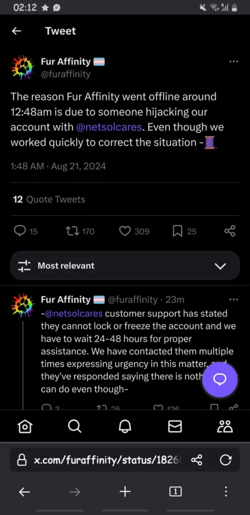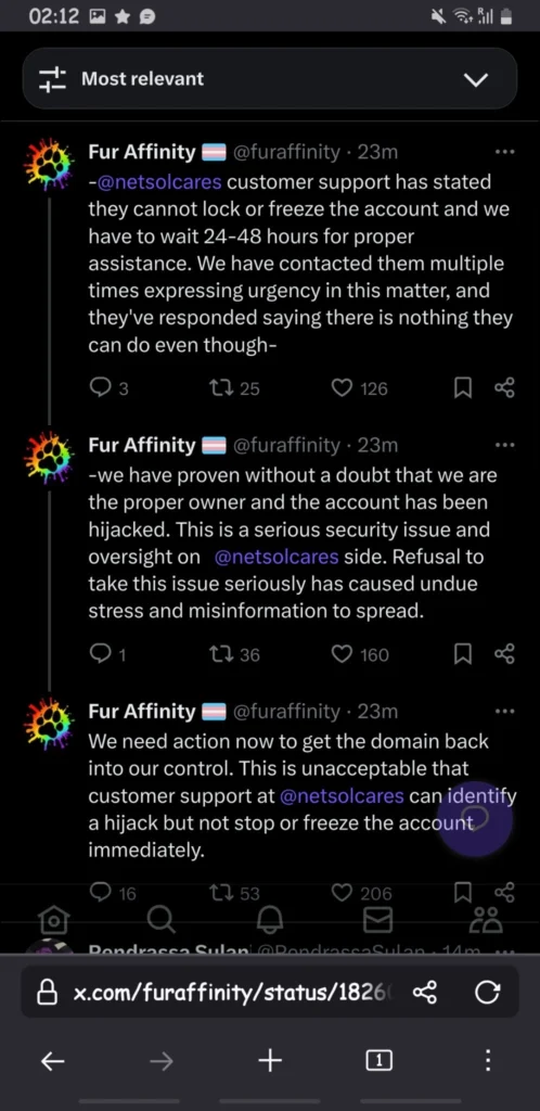 Further updates at 6 PM revealed ongoing frustrations with the hosting service provider, netsolcares. The company has allegedly informed Fur Affinity that freezing or locking the compromised account was not possible, necessitating an extended wait period of 24 to 48 hours. As this article goes to press, the hacker appears to maintain control over the account.