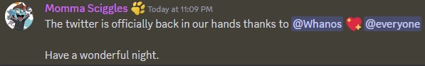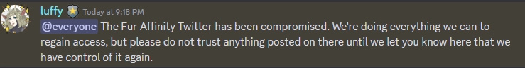 11PM: The Fur Affinity handle on twitter was changed by the hacker, allowing another user to take over it.