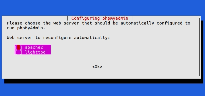 To tie it all up, we’ll install php, mariadb and phpmyadmin: apt install php mariadb-server phpmyadmin. phpmyadmin will prompt you for which web server you’re using, select apache2 then press ok.