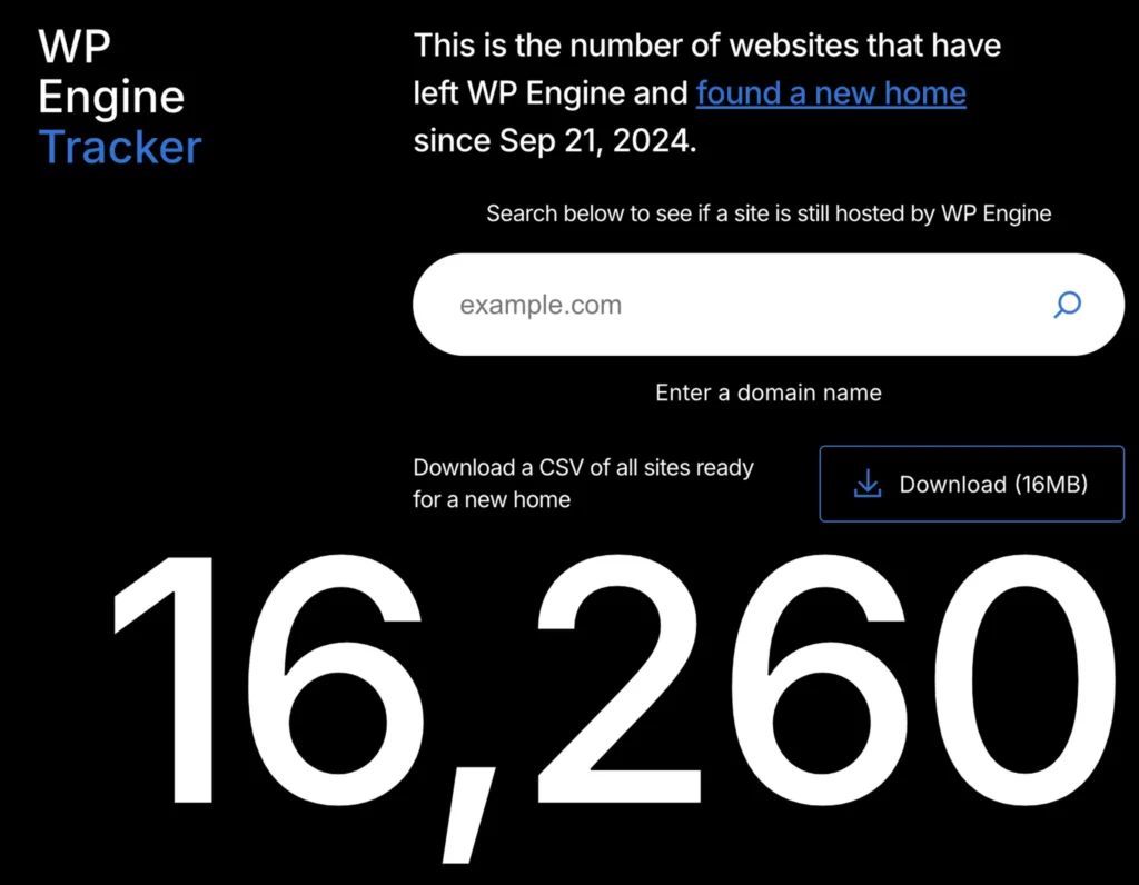 And to add insult to injury, in a 5d chess move, Matt himself, not through Automattic this time, launched his very own “WP Engine tracker” page, listing every single website to leave the service due to his attacks. Showing how proud he was in causing problems to the non-involved users.