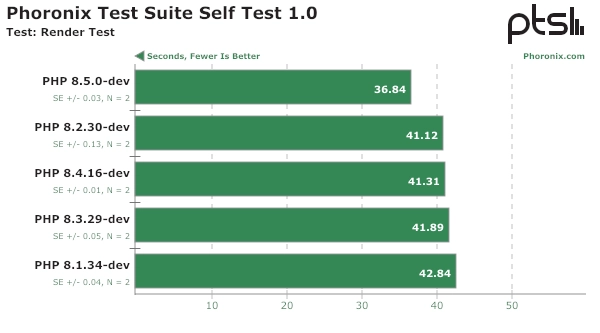 Independent early benchmarking from Phoronix shows PHP 8.5 performing best among the 8.x releases in several workloads they ran, including page/rendering tests used in their article visuals. The site reports “nice performance gains” in the early tests it ran for today’s release. As always, real-world results will vary by application, extensions, and deployment choices.