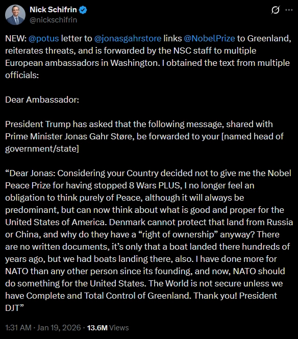 “Dear Jonas: Considering your Country decided not to give me the Nobel Peace Prize for having stopped 8 Wars PLUS, I no longer feel an obligation to think purely of Peace, although it will always be predominant, but can now think about what is good and proper for the United States of America. Denmark cannot protect that land from Russia or China, and why do they have a “right of ownership” anyway? There are no written documents, it’s only that a boat landed there hundreds of years ago, but we had boats landing there, also. I have done more for NATO than any other person since its founding, and now, NATO should do something for the United States. The World is not secure unless we have Complete and Total Control of Greenland. Thank you! President DJT”