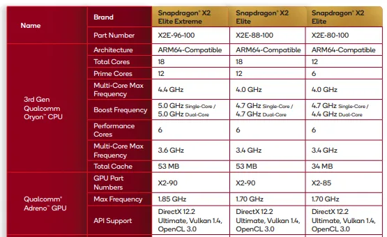 The new specs are crazy, specially the Extrme version and its 18 cores. They’re all made using TSMC’s 3nm nodes, have a lot of cache(for an ARM CPU), LPDDR5 up to 9523 MT/s(128GB capacity), new Adreno GPUs(which tend to be ahead of ARM’s Mali, usually used by mediatek), 80 TOPS NPU, etc. You can see the full specs here.